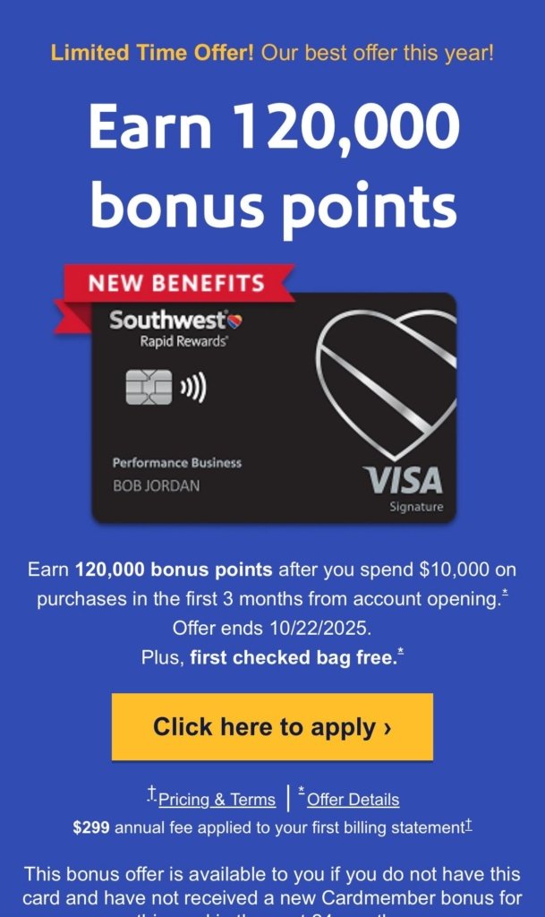 - Southwest Rapid Rewards Performance Business Card: 80,000 points after $5,000 spend (standard offer)
